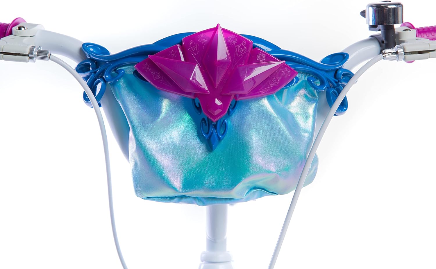 The official Disney Frozen 12 inch girls bike is the ideal way for your little one to start their cycling journey alongside Anna & Elsa with this stunning bike. Finished in signature blues, deep purple colours and graphics, plus the unique Frozen handlebar carry pouch, this is the ideal first bike for children learning to ride. This 12 inch kids bike is suitable for children 3-5years old or 98-112cm in height. The comfortable seat can be raised as your child grows. This Official Disney Frozen bike features Huffy's Quick Connect assembly system. Arriving 85% assembled, the finishing steps are quick and simple. Click the handlebars in and secure by hand tightening the collar. Flip our the pedals, no screwing in required! If using stabilisers, they simply click in quickly and can be easily removed once skills have progressed. Finally inflate the tyres to your desired pressure, check the brakes, and off you go!